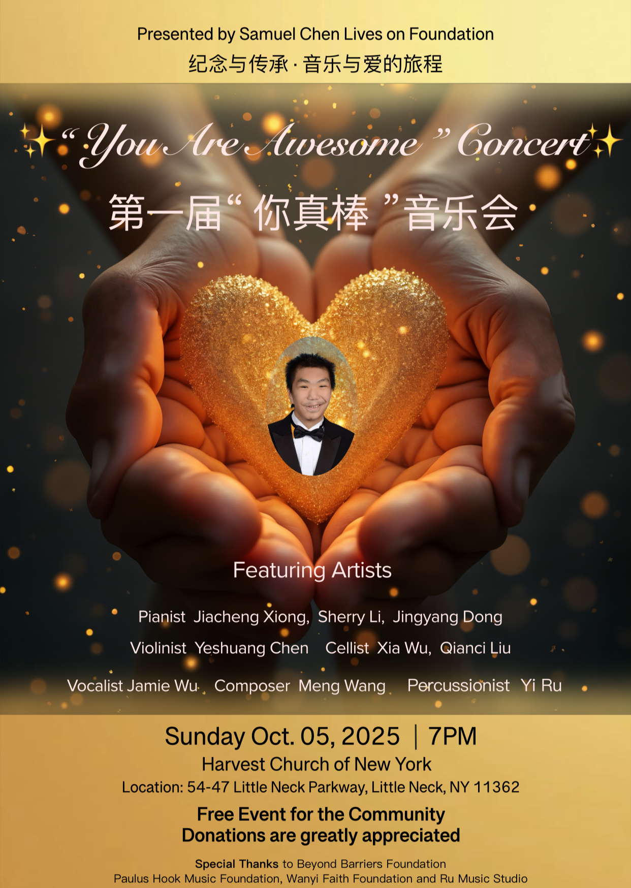 LONG ISLAND AND QUEENS, NY, UNITED STATES, October 2, 2025 /EINPresswire.com/ -- Presented with honor by the Samuel Chen Lives on Foundation, the first annual “You Are Awesome” Concert—a journey themed "Remembrance and